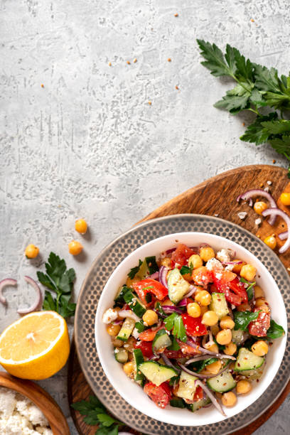 Kichererbsen, Gemüse und Feta in einer großen Schüssel vermengen.